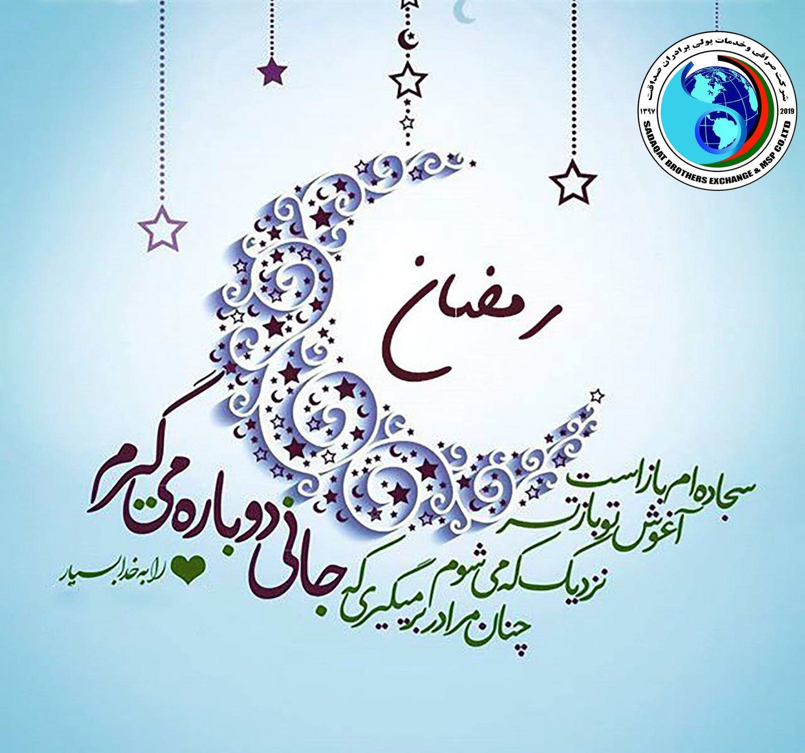 شرکت صرافی و خدمات پولی برادران صداقت حلول ماه مبارک رمضان ، ماه بهار قرآن، روشنی قلوب را به تمامی مسلمانان افغانستان و جهان تبریک و تهنیت عرض میدارند
