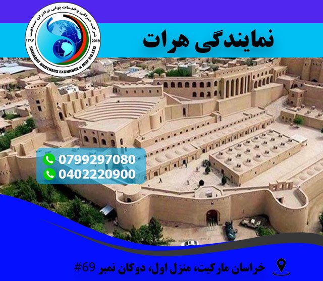 شرکت صرافی و خدمات پولی برادران صداقت افتخار دارد که نمایندگی خود را در خراسان مارکیت ولایت هرات افتتاح نموده است
